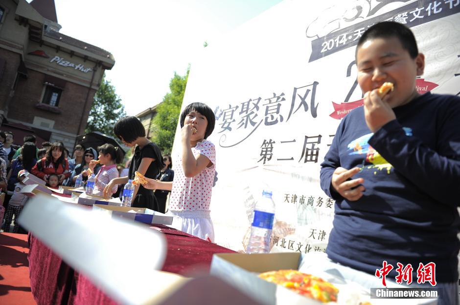5月2日,几位儿童在天津意大利风情街西餐文化节上挑战“披萨大胃王”。活动规则是在限定时间内,吃入最多披萨者获胜。据主办方介绍,比赛是让游客能轻松愉悦地感受西餐美食文化独特魅力。中新社发 佟郁 摄