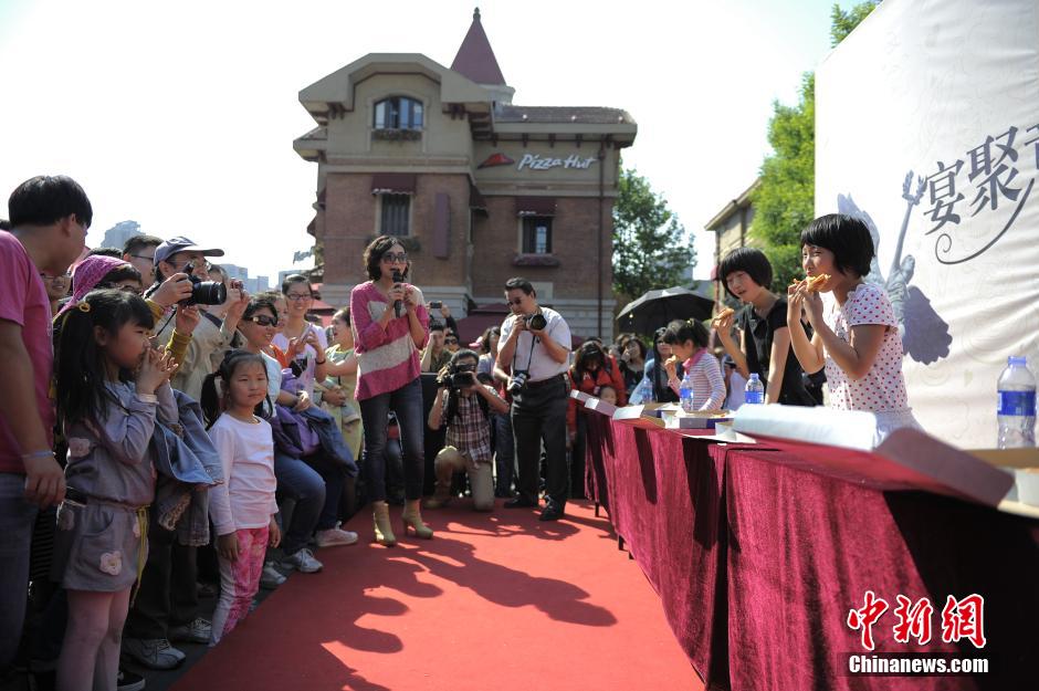 5月2日,几位儿童在天津意大利风情街西餐文化节上挑战“披萨大胃王”。活动规则是在限定时间内,吃入最多披萨者获胜。据主办方介绍,比赛是让游客能轻松愉悦地感受西餐美食文化独特魅力。中新社发 佟郁 摄
