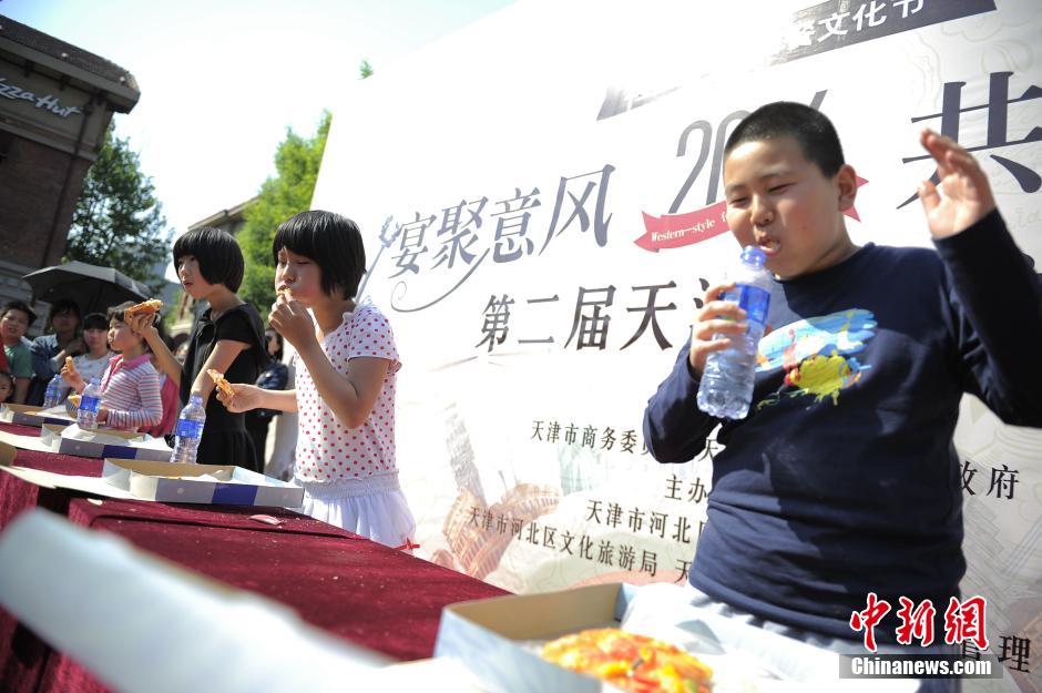 5月2日,几位儿童在天津意大利风情街西餐文化节上挑战“披萨大胃王”。活动规则是在限定时间内,吃入最多披萨者获胜。据主办方介绍,比赛是让游客能轻松愉悦地感受西餐美食文化独特魅力。中新社发 佟郁 摄