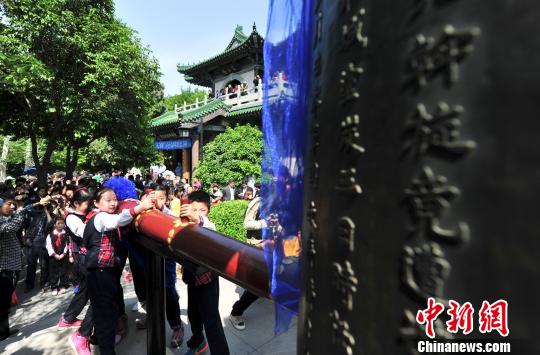 5月3日,小学生撞响“五三钟”铭记“勿忘国耻”。中新社发 张勇 摄