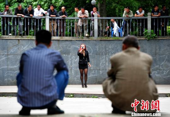 5月3日,湖北武汉,武昌桥头堡公园吹拉弹唱轮番登场热闹非凡,一位30来岁女歌手的激情演唱吸引了众多市民驻足聆听。中新社发 张畅 摄
