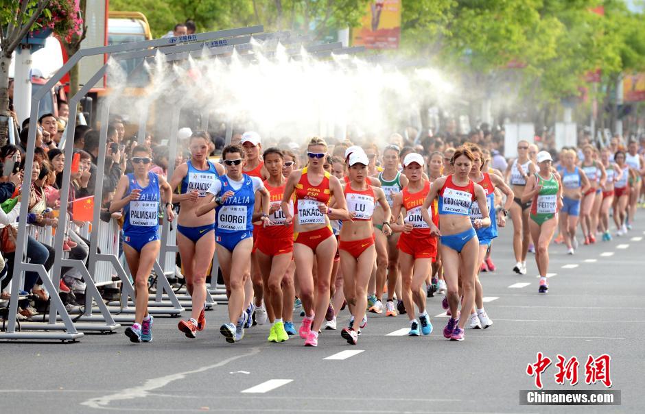 5月3日下午,女选手经过赛道的喷淋区域。当日,2014年国际田联竞走世界杯赛女子20公里比赛在江苏太仓举行,激烈地比拼,加上气温升高,经过2、3圈赛程后,选手们流失了大量汗水,纷纷来到指定区域,通过喝水、海绵淋头以及喷淋等方式,进行“补水”降温,此景成为了当天比赛中的一道靓丽风景。中新社发 王思哲 摄