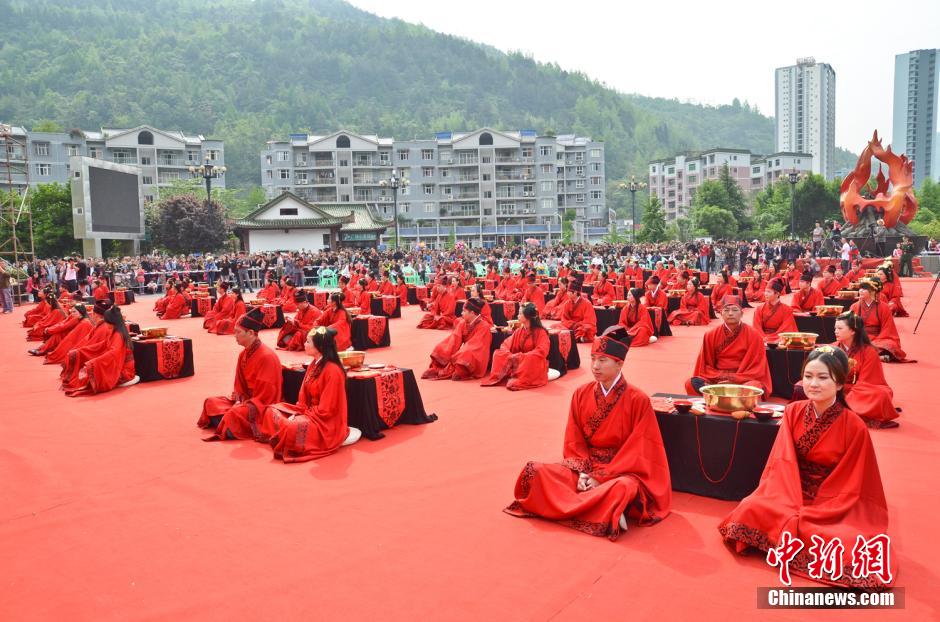 五一小长假期间,首届酉阳桃花源大型传统汉服集体婚典在国家5A级旅游景区——重庆酉阳桃花源景区盛大揭幕,来自国内外52对伉俪身着正红色镶玄边的汉式婚礼袍服,依周礼婚典遗规举行盛大集体婚礼,典雅庄重、吉庆祥和,并感受中国传统文化之美。新文采 摄