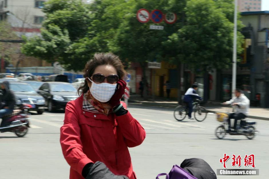 5月4日,由于山西太原受大风降温天气影响,且多地道路改造,致使尘沙漫天,市民不得不“全副武装”出行。中新社发 张云 摄
