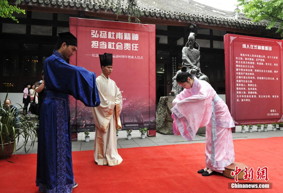 5月4日,四川成都杜甫草堂博物馆在杜甫草堂为来自四川省人民医院护士学校学生及成都信息工程学院学生代表举办成人礼。仪式在“加笄典礼”中拉开帷幕。庄严肃穆的古装成人仪式映衬着杜甫草堂的千年古韵,使人们仿佛身临千年前的冠笄之礼现场,让在场的青年感受到了悠久的传统文化。安源 摄