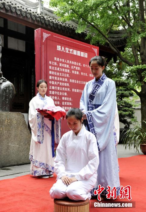 5月4日,四川成都杜甫草堂博物馆在杜甫草堂为来自四川省人民医院护士学校学生及成都信息工程学院学生代表举办成人礼。仪式在“加笄典礼”中拉开帷幕。庄严肃穆的古装成人仪式映衬着杜甫草堂的千年古韵,使人们仿佛身临千年前的冠笄之礼现场,让在场的青年感受到了悠久的传统文化。安源 摄