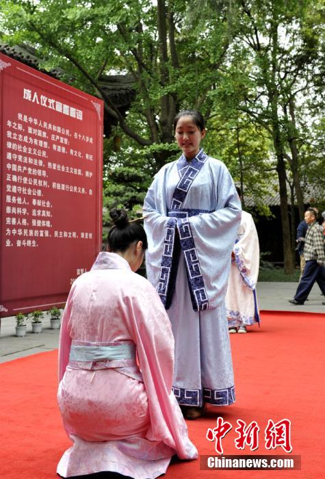 5月4日,四川成都杜甫草堂博物馆在杜甫草堂为来自四川省人民医院护士学校学生及成都信息工程学院学生代表举办成人礼。仪式在“加笄典礼”中拉开帷幕。庄严肃穆的古装成人仪式映衬着杜甫草堂的千年古韵,使人们仿佛身临千年前的冠笄之礼现场,让在场的青年感受到了悠久的传统文化。安源 摄