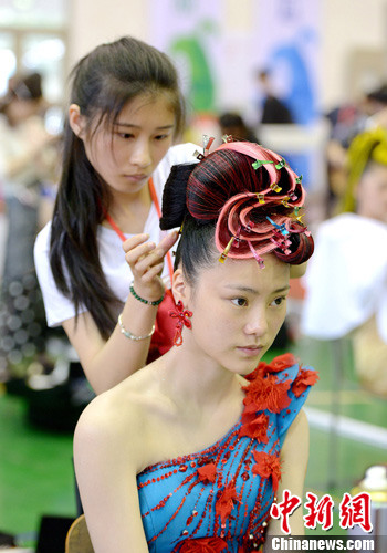 5月4日,由浙江省教育厅、浙江省人力资源和社会保障厅主办的浙江省中等职业学校“美容美发与形象设计”职业技能大赛在浙江纺织服装职业技术学院举行。图为参赛选手在进行晚宴妆比赛。中新社发 王国海 摄