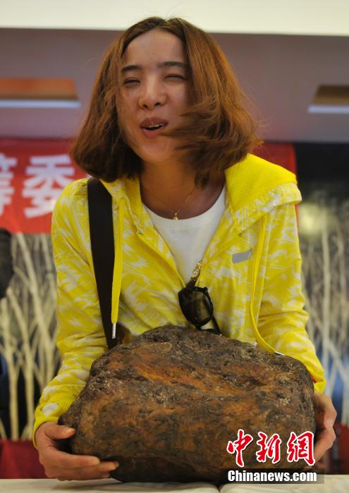 5月5日,山西太原,民众好奇地抚摸泡在水中就生长出“绿绒毛”的陨石。当日,来自中国各地的30余名陨石收藏者齐聚山西,交流展示各自收藏的陨石。本次交流展出的陨石有传统分类的铁陨石、石陨石和铁石陨石,最重的约40公斤,最小的只有米粒大小。中新社发 韦亮 摄