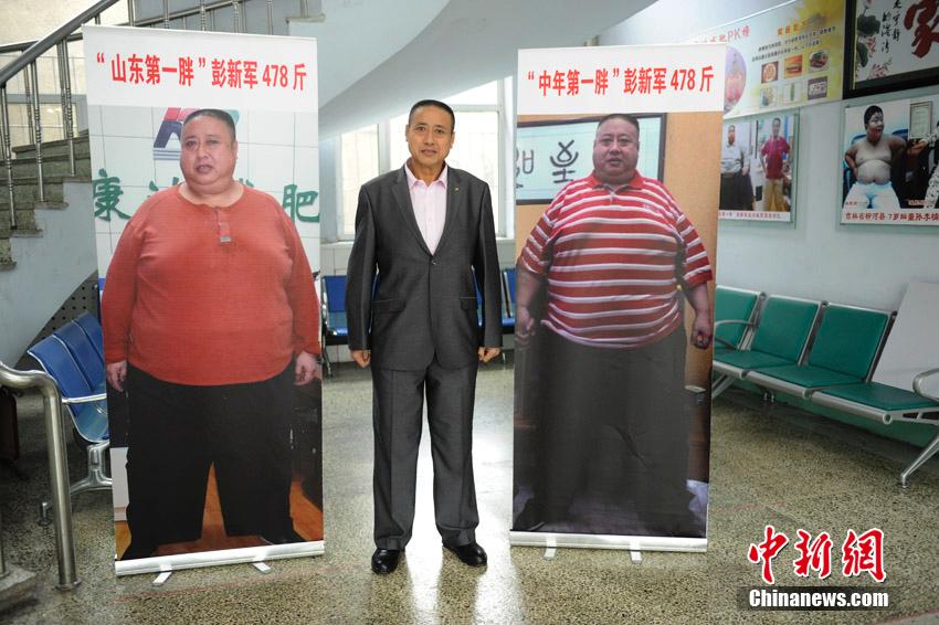 今年47岁的彭新军曾经体重达到478斤,被称为“山东第一胖”。两年前他从山东来到长春一家减肥医院进行治疗,如今体重成功减到198斤。彭新军说,这两年来,他每天都要做火疗、按摩、针灸、远动等减肥项目,减肥的路真的很辛苦,但是为了自己的家人与生命健康,他还要继续坚持下去。图为彭新军站在从前的照片前面,展示他两年来的减肥成果。张瑶 摄