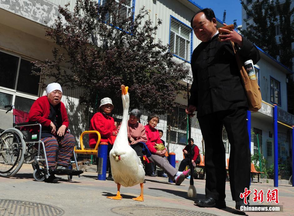 石家庄老人每天遛“宠物鹅”