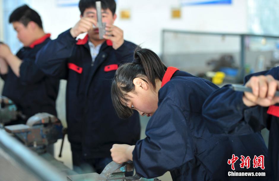 5月6日,一女生参加钳工项目竞技。当日,在济南第八职业中专学生技能大赛上,一女生秀钳工“绝活”,技压群雄,脱颖而出。中新社发 张勇 摄