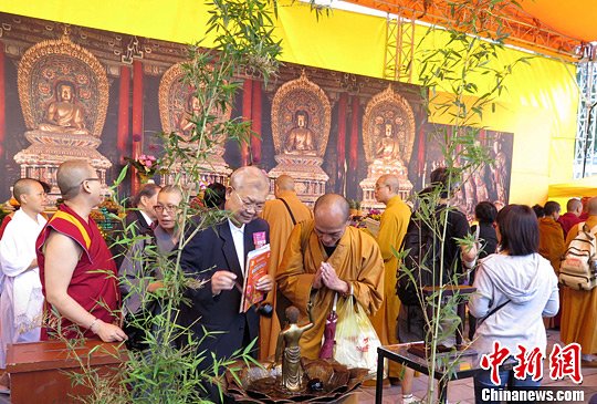6日香港佛教联合会在红磡香港体育馆举行浴佛典礼,纪念佛陀释迦牟尼诞生2558年,吸引大批善信、僧侣参加。中新社发 赵建华 摄