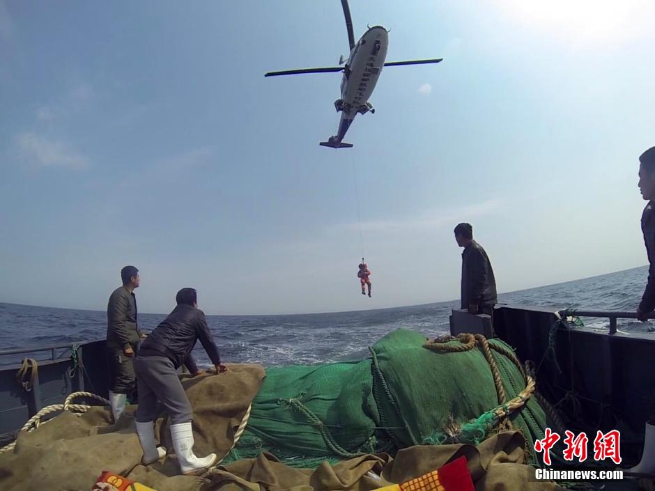 5月6日,在大连东北方向约100海里海域,“辽丹渔捕5071”渔船上一渔民在修理绞缆机时不慎将胳膊卷入绞机,交通运输部北海救助飞行队驻大连基地派出一架专业救助直升机,将船上重伤渔民运至陆地,该渔民已被送往大连市中心医院抢救。李允楠 摄