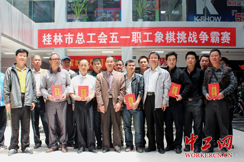 5月1日上午在桂林市工人文化宫组织象棋十六强LED实况直播争霸赛把此活动推向高潮,经过近4小时的计时赛,广西师大教师崔天胜荣获冠军、永福县恒达机械厂职工曾金昌荣获亚军,唐长清、罗建忠、曾德桂、秦华志、陈俊杰等14名干部职工进入庆五一职工象棋围棋挑战争霸赛十六强。此次比赛,云集了全市围棋象棋高手,既是一次职工文化大比拼,又是一次广大干部职工顽强拼搏、勇争第一的精神风貌的展示,受到桂林市领导的表扬和职工群众的称赞。
