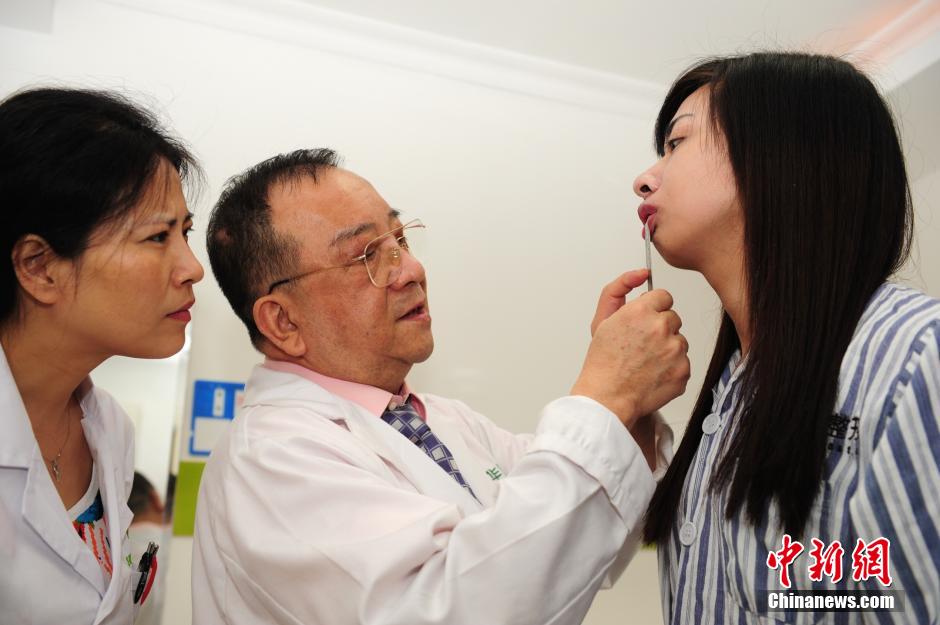 5月7日,曹孟君院长对患者舒曼音(右)进行手术前的检查。男士舒曼音现年27岁,身高1.72米,多年前就想做变性手术,他在4年前就已准备好易性病的诊断证明、5位以上亲人同意证明、当地派出所出具的无犯罪记录等八项证明。据了解,此次变性手术分两期进行,需要面部整容和变性手术。中新社发 陈文 摄