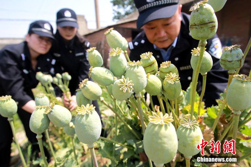 2014年5月6日,河南许昌,在铲除罂粟集中统一行动中,民警展示铲除的罂粟。