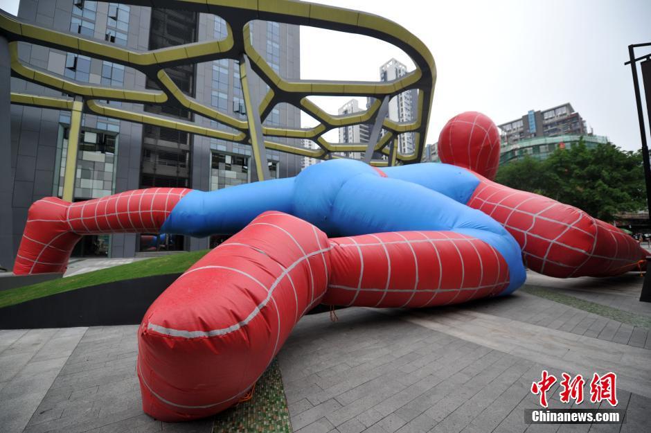 5月7日,一座体积庞大的巨型蜘蛛侠模型亮相福州街头,吸引了许多过往市民驻足观赏拍照留念。张斌 摄