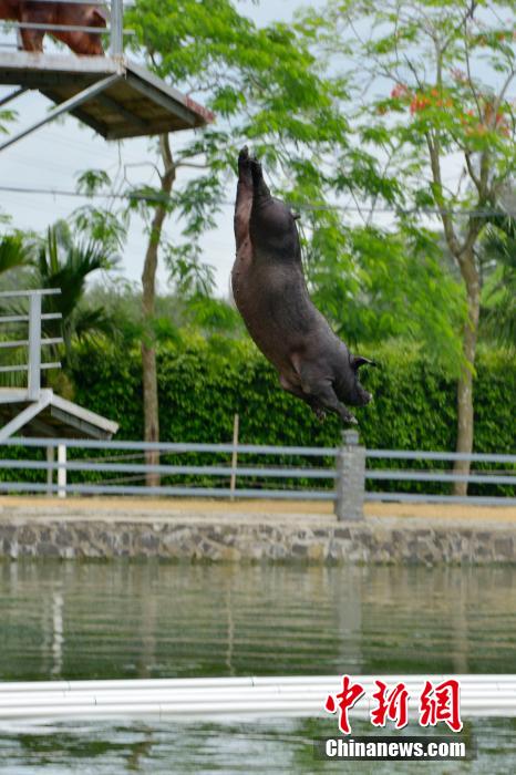 5月7日,海南省文昌市东路镇一休闲度假村每天在用于垂钓的鱼塘举行肥猪高台跳水表演,大小两群猪分别在3至5米不同高度的跳板上,在工作人员的指导下跳入水中,引众多游客专程前来观看。中新社发 骆云飞 摄