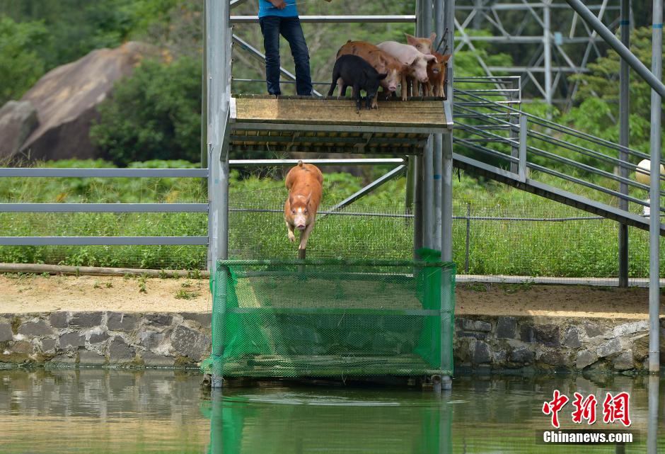 5月7日,海南省文昌市东路镇一休闲度假村每天在用于垂钓的鱼塘举行肥猪高台跳水表演,大小两群猪分别在3至5米不同高度的跳板上,在工作人员的指导下跳入水中,引众多游客专程前来观看。中新社发 骆云飞 摄