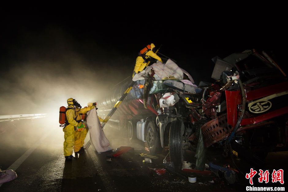 5月7日晚20时30分,浙江杭金衢高速浦江段发生多车相撞事故,一辆小货车翻车起火,一辆运送氢氟酸的危化品车泄漏,造成多人不同程度受伤。截止8日上午10时,已有3人因吸入氢氟酸中毒,经医院抢救无效死亡。胡丰盛 摄