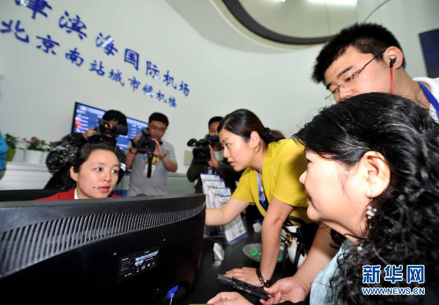 当日,天津滨海国际机场北京南站城市候机楼暨京津空铁联运正式启用。从北京到天津机场乘坐航班的旅客可以直接从北京南站购买城际列车票和机场大巴车票,乘坐京津城际列车到达天津站,然后乘坐机场大巴直接抵达天津机场航站楼,通过安全检查后在空铁联运服务柜台办理城际列车票和机场大巴车票的退款手续。这是天津机场将空铁联运服务持续向京津冀地区延伸的重要一步。新华社记者岳月伟摄