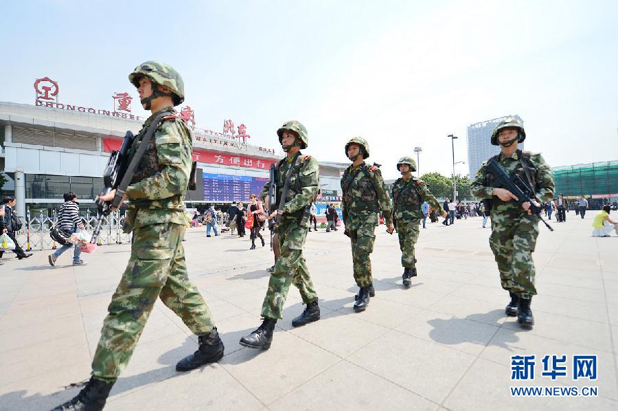 从今年3月开始,武警重庆总队官兵在重庆市的各大车站、码头、商圈和机场以及市区主干道等地加强巡逻,维护社会稳定,保障群众安全。新华社发(张春华 摄)