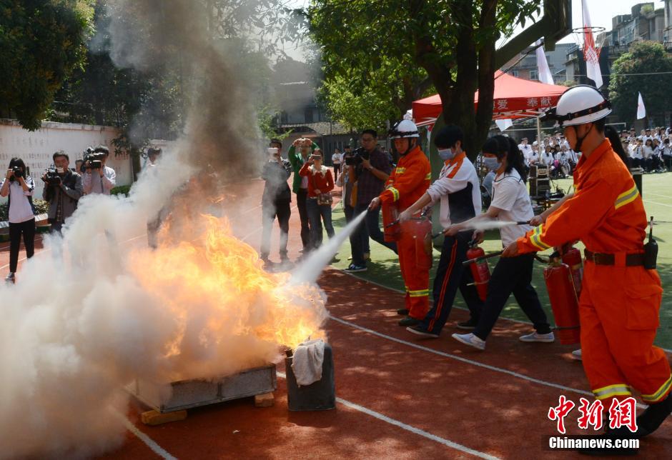 5月8日,参加福州“生命救护”大型演练活动的消防官兵第一时间赶到现场,架云梯、操水枪、抬担架,迅即展开灭火、疏散和搜救行动。当日,福州市红十字会携手市教育局、市消防支队、福建省血液中心,在福州闽侯县职业中专学校举行“生命救护”大型演练活动以此纪念第67个世界红十字日,传播人道精神,普及自救互救知识和技能。500多名师生、消防官兵、红十字志愿者一起参加了该大型演练活动。中新社发 刘可耕 摄