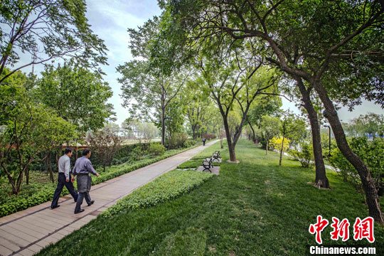 近日,天津首座城市大型绿色沿线公园——“天津绿道公园”完成段落建设。据了解,该公园利用现状资源,以天津老陈塘铁路沿线为轴线,主路在废弃的铁轨上搭建木板而成,设计上突出大绿自然,生态低碳。图为天津首座城市大型绿色沿线公园。中新社发 佟郁 摄