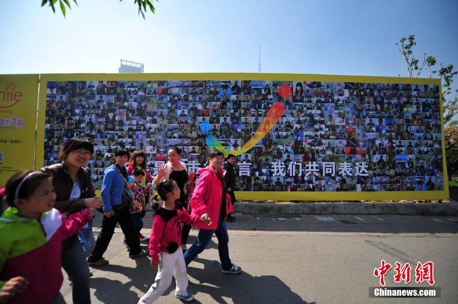 5月8日,沈阳推出“爱上微笑的沈阳”巨幅笑脸墙。当日,是第66个世界微笑日。笑脸墙座落于沈河区热闹路、青年大街至顺通市场之间,利用工地围档沿街展示,全长350多米,是在市民征集、摄影师专题拍摄的3万多幅微笑照片中精选1000多幅优秀作品组合拼接而成。中新社发 于海洋 摄