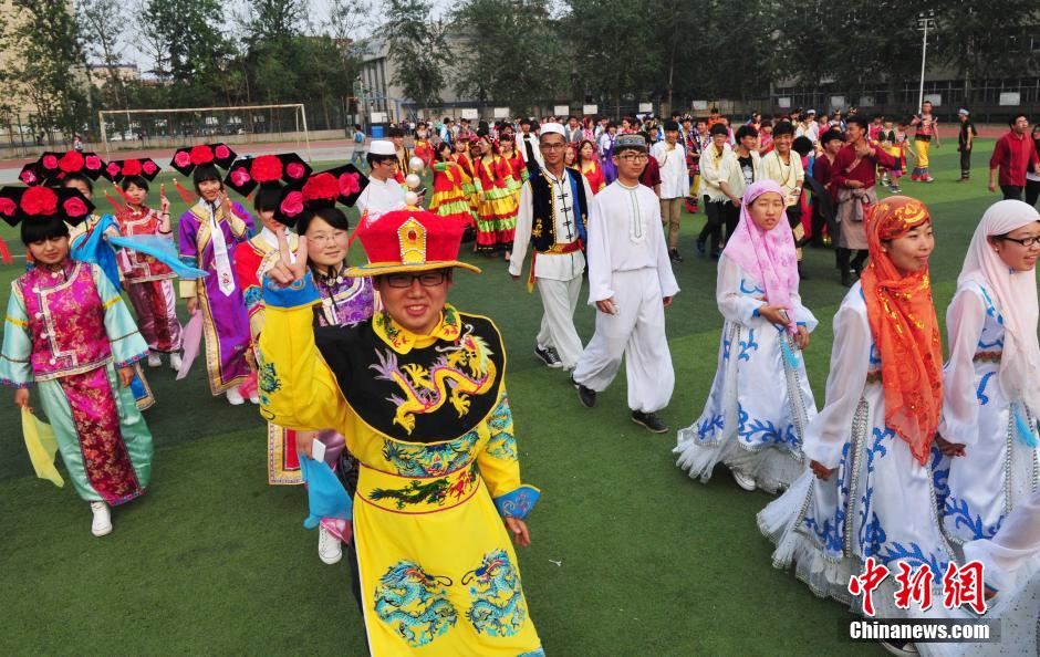 5月8日下午,在河北师范大学附属民族学院,蒙古族、藏族、苗族、彝族、满族等14个少数民族的百余名学生,身着本族特色服装,佩戴独具民族特色饰品,展示各自特有的风采。各民族学生你唱我舞,相互拍照特有的民族服饰,其乐融融胜似过节。中新社发 翟羽佳 摄
