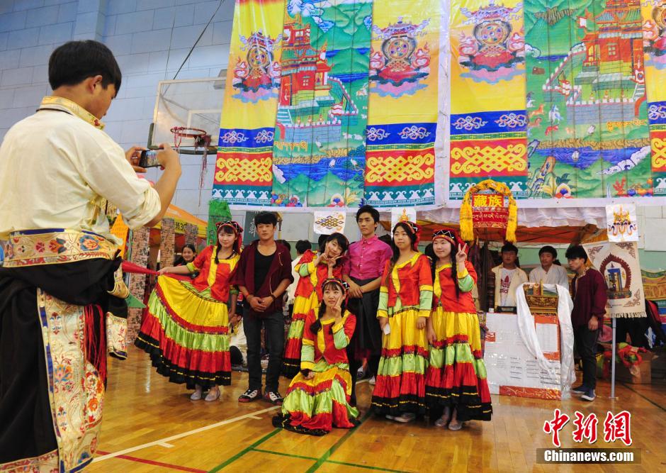 5月8日下午,在河北师范大学附属民族学院,蒙古族、藏族、苗族、彝族、满族等14个少数民族的百余名学生,身着本族特色服装,佩戴独具民族特色饰品,展示各自特有的风采。各民族学生你唱我舞,相互拍照特有的民族服饰,其乐融融胜似过节。中新社发 翟羽佳 摄