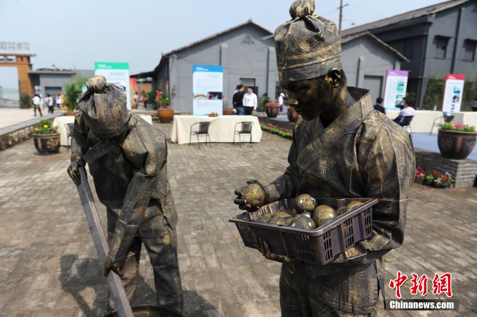 5月8日,以“千年唐风陶城两岸创意文苑”为主题的2104海峡两岸文创名人名企长沙(铜官)行活动,在长沙举行。现场的活人行为艺术,吸引了参观者的驻足观看。工作人员用这种特殊的方式展示长沙铜官窑的发展。据了解,长沙铜官窑始于初唐。盛于中晚唐,终于五代,时间延续300多年。其烧制出来的瓷器品种丰富,美观精致,实用性强。长沙窑是中国釉下彩绘的第一个里程碑,为唐以后的彩瓷发展奠定了基础。 杨华峰 摄