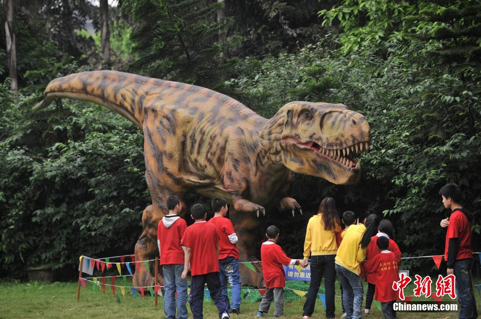5月8日,来自智力残疾人康复托养中心的30余名残疾儿童正在重庆珊瑚公园内与恐龙互动。“恐龙欢乐节”重庆站,残疾儿童在老师的带领下与100余头仿真恐龙欢乐互动。陈超 摄