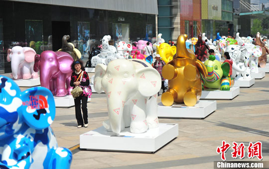 5月8日,沈阳街头的多彩“大象阵”。由76只大象模型组成的“大象阵”一亮相就受到市民的热捧,吸引不少民众围观。