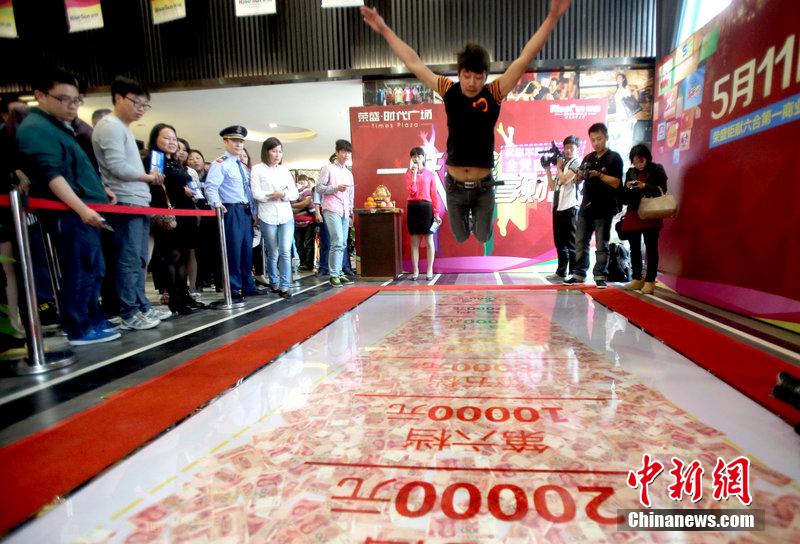 2014年5月8日,南京,红地毯可能司空见惯,但用钱铺成的星光大道你见过吗?荣盛时代广场售楼处里用10万人民币铺在地上,不少来选购商铺的人都感叹见识到什么叫“真土豪”了。“开盘优惠X点,首付X成优惠X点,一次性付款X点……”这样的优惠在买房时是寻常见到的。但荣盛时代广场今日认筹时,举办了一出别具匠心优惠活动,购铺者立定跳远,跳多远,就优惠多少。