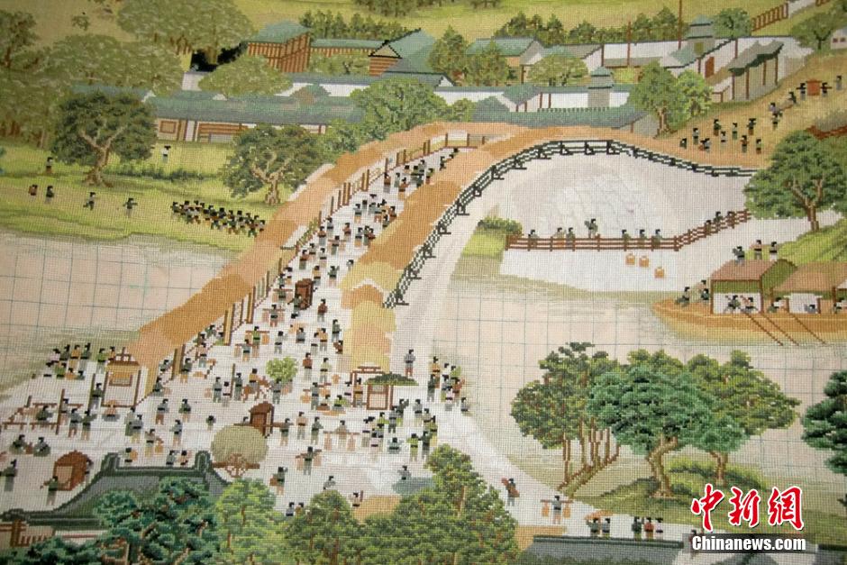 5月8日,家住南京市栖霞区燕子矶街道笆斗山居民小组的金成荣和媳妇、女儿携手合作完成的十字绣版《清明上河图》公开展示,这幅十字绣长达22米,用了三年多时间,要七、八个人才能完全展开,堪称“巨作”,吸引了不少邻居来围观。