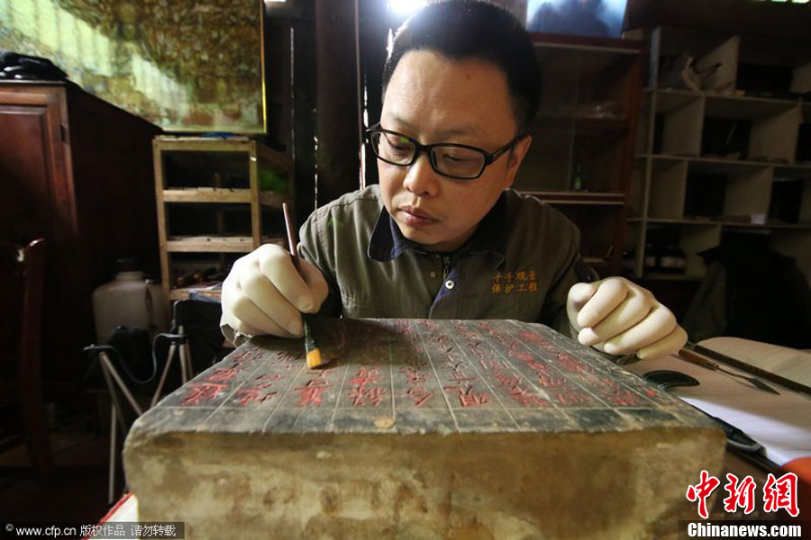 5月8日,重庆市大足区宝顶山千手观音造像抢救性保护工程现场,工作人员对主尊造像腹部“暗格”发现的历史遗物进行考察研究。罗国家 摄