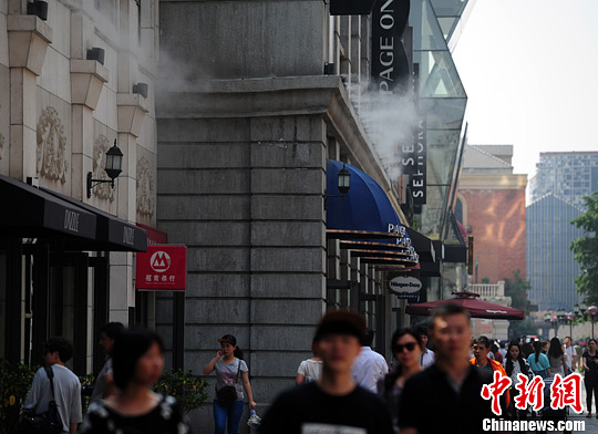 5月8日,武汉楚河汉街开启水雾降温装置,让被炙热的骄阳“煎烤”的市民和游客感受到一丝清凉。立夏过后,武汉逐渐进入夏季模式,温度逼近30℃。中新社发 张畅 摄