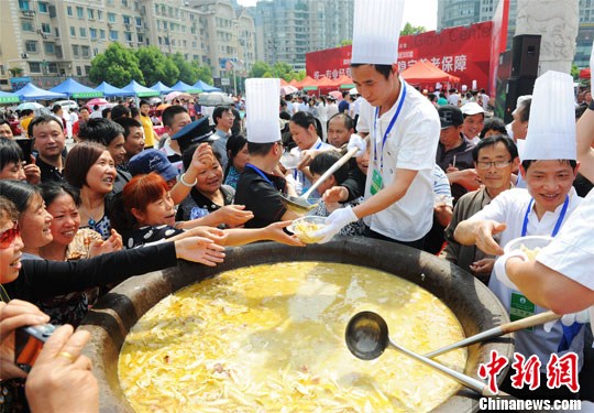 竹笋是临安的特产,当天临安“百笋宴”美食节上,厨艺高手们献出绝技,展开角逐,制作百道以笋为主要原料的美味佳肴。图为5月8日,浙江杭州临安“百笋宴”美食节上,大锅煮笋送市民。中新社发 金凯华 摄