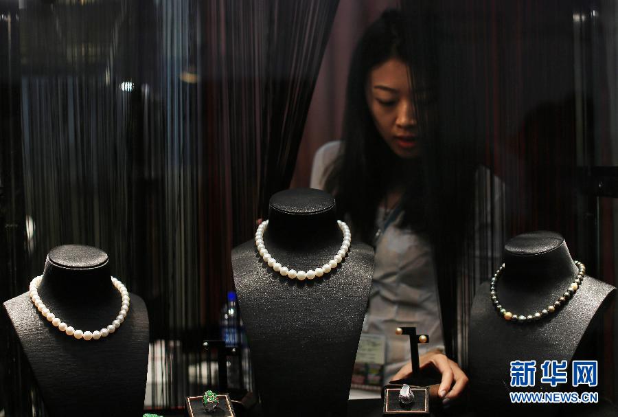 这是5月9日在博览会上拍摄的一家珍珠展示柜台。