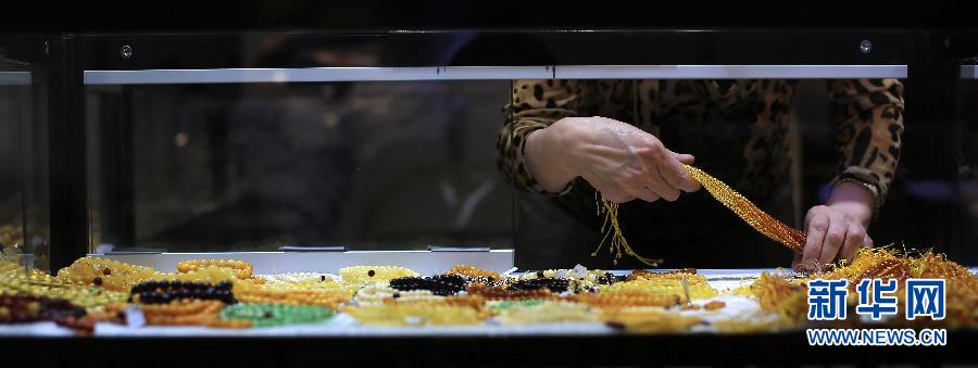 这是5月9日在博览会上拍摄的一家琥珀展示柜台。新华社记者 姚剑锋 摄