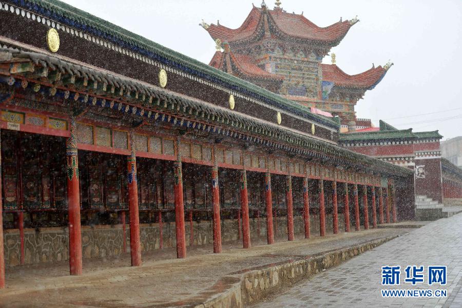 5月9日拍摄的雪中的米拉日巴佛阁。当日,受较强冷空气影响,甘肃省甘南藏族自治州部分地区由降雨转为降雪天气,气温普遍下降6摄氏度以上。 新华社记者陈斌摄