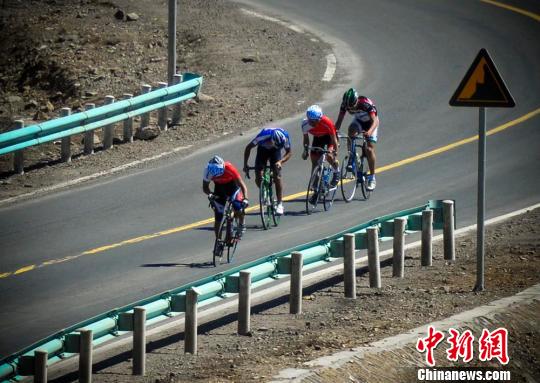 5月10日,新疆首届“骑行天山”环天山公路自行车赛第一站赛段比赛在新疆昌吉回族自治州木垒县举行出发仪式,来自12家自行车俱乐部的150名选手,骑行145公里到达终点新疆吐鲁番地区鄯善县。图为选手挑战长33公里的木鄯公路缓坡段。刘新 摄