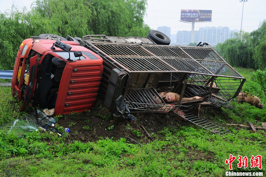 5月11日中午12时许,苏嘉杭高速江苏苏州高速入口处,一辆牌照为“赣L09×××”的厢式货车行驶至该路段时冲出高速护栏,发生侧翻,部分生猪“冲”出车厢,在护栏边的草地上悠然自得地吃草“放风”。据驾驶员讲,当时车上装载有70多头生猪,是从江苏姜堰市运载至上海江桥农贸批发市场,行至该路段时发生侧翻,导致驾驶室前挡风玻璃完全撞碎,有几头生猪卡在车厢中当场死亡,幸好车上两人并无大碍。伍疆 摄