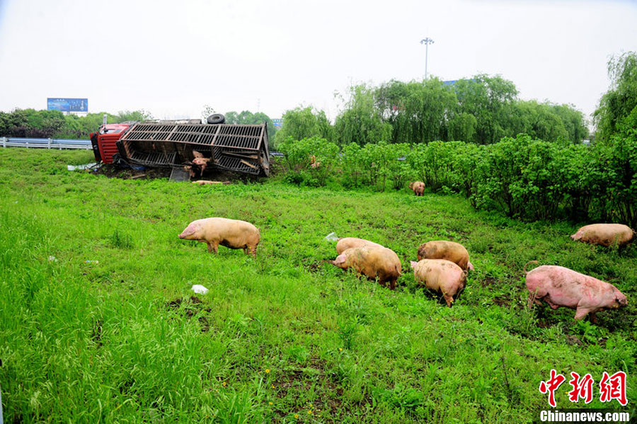 5月11日中午12时许,苏嘉杭高速江苏苏州高速入口处,一辆牌照为“赣L09×××”的厢式货车行驶至该路段时冲出高速护栏,发生侧翻,部分生猪“冲”出车厢,在护栏边的草地上悠然自得地吃草“放风”。据驾驶员讲,当时车上装载有70多头生猪,是从江苏姜堰市运载至上海江桥农贸批发市场,行至该路段时发生侧翻,导致驾驶室前挡风玻璃完全撞碎,有几头生猪卡在车厢中当场死亡,幸好车上两人并无大碍。伍疆 摄
