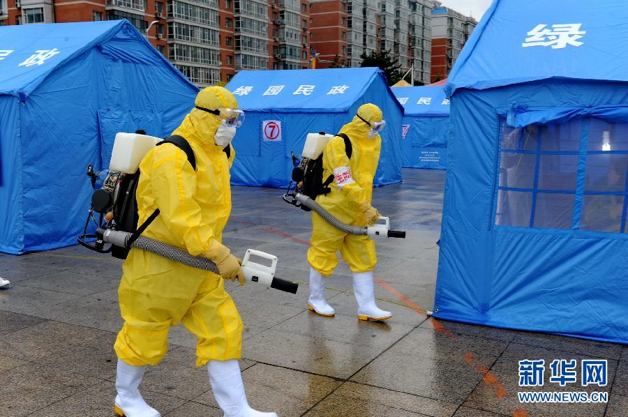 5月12日,防疫人员在演练中对临时避难帐篷进行消杀灭菌。新华社记者 张楠 摄