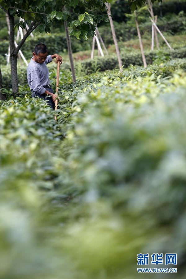 5月10日,福建省泉州市安溪县出口量最大的茶叶企业——八马茶业生态茶园工人在对茶树施行日常管理。新华社记者 沈伯韩 摄