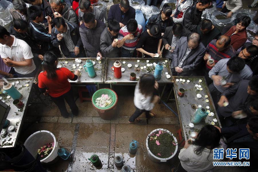 5月10日,在福建省泉州市安溪县中国茶都茶业批发市场,一些前来采购铁观音春茶的客商在品尝茶业样品。新华社记者 沈伯韩 摄