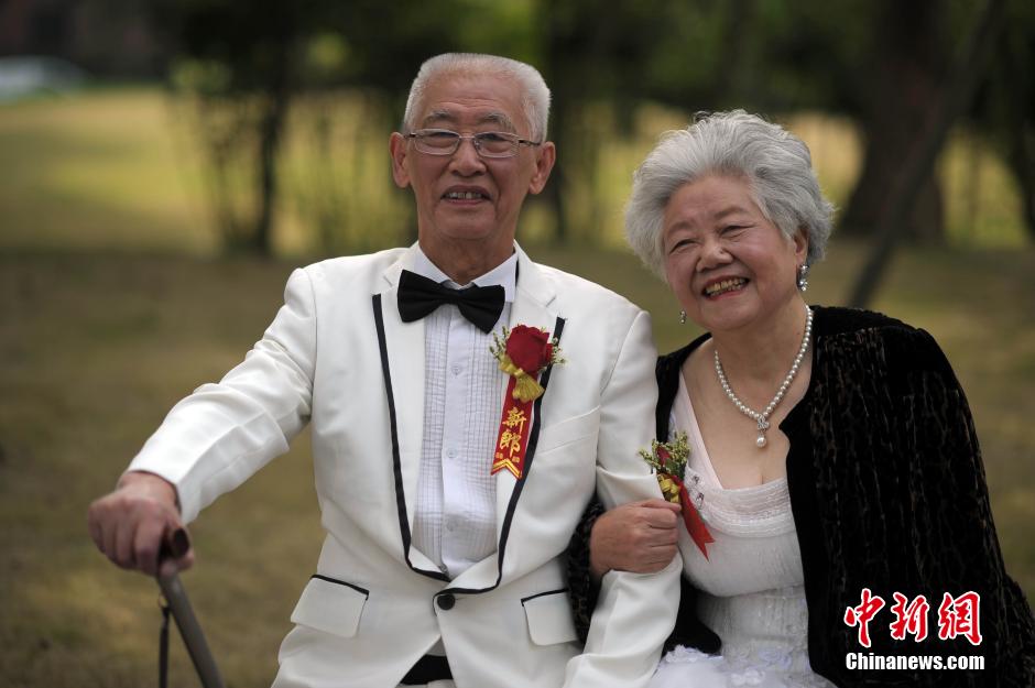 5月11日,手持火红玫瑰、身披白色婚纱,19对携手走过半个多世纪风雨的金婚老人在重庆青杠护养中心举行了集体金婚庆典。据悉,19对金婚伉俪中年龄最大94岁,最小70岁,婚龄最长已70年。中新社发 渝友 摄